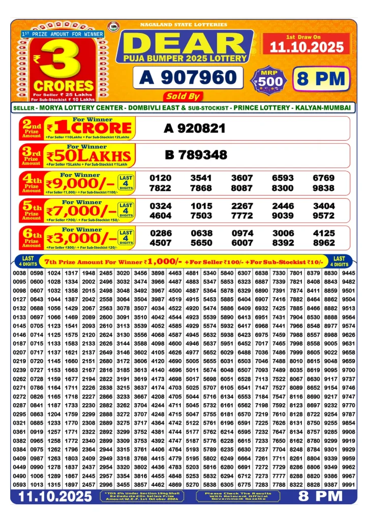The results for the Dear Puja Bumper Lottery of October 11, 2025, will be announced at 8:00 PM. The top prize for today’s draw is INR 5 Crore, and you can check the winning numbers after the draw through the official Nagaland State Lottery Sambad website or related platforms.